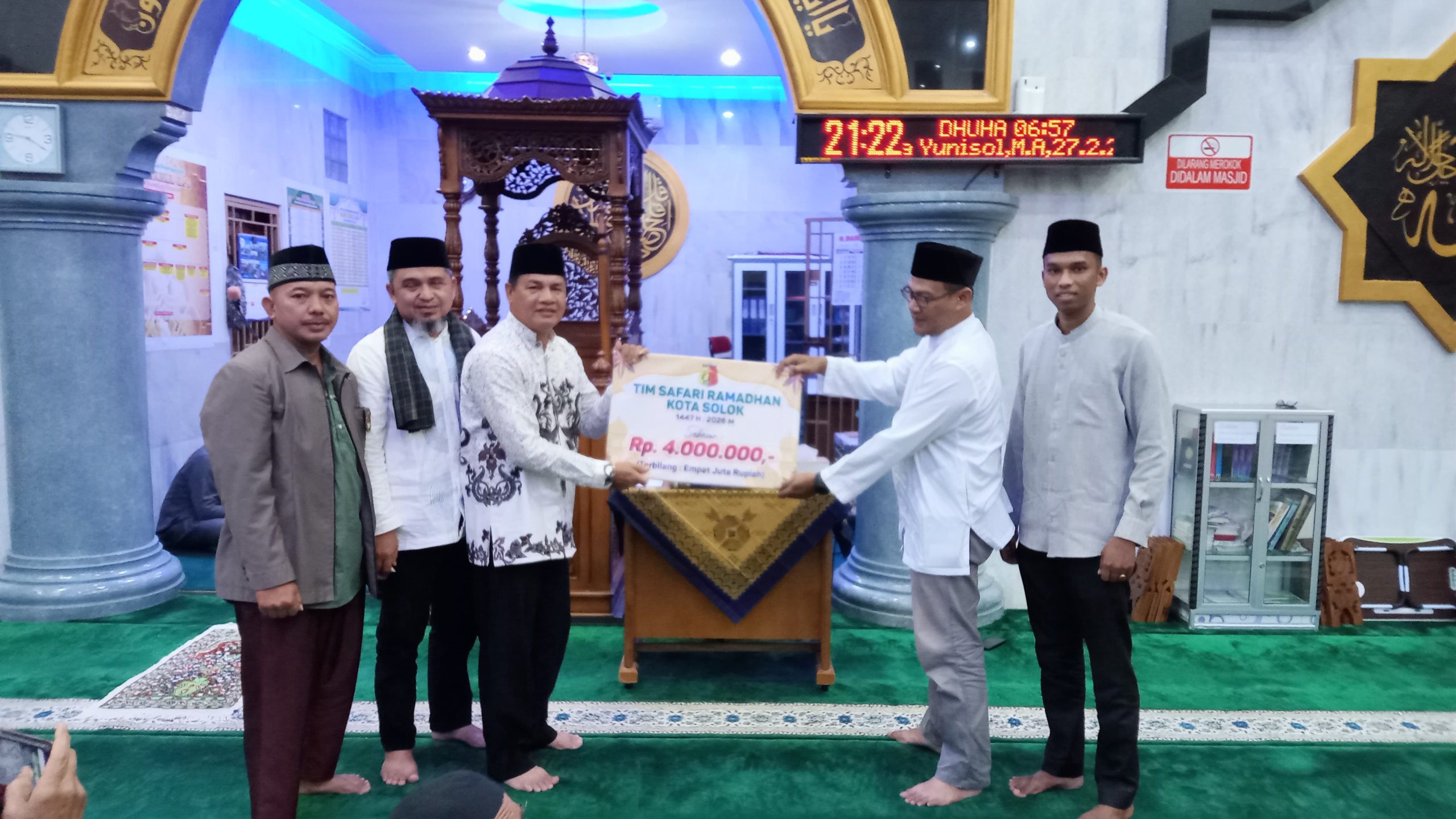 PIKIRANSUMBAR.com – Tim XXIII Safari Ramadhan (TSR) 1447 H Pemerintah Kota Solok yang dipimpin Kepala Dinas Kependudukan dan Pencatatan Sipil (Dukcapil), Afrizon, S.E., M.Si., menyerahkan bantuan sebesar Rp4 juta untuk mendukung operasional Masjid Nurul Ilmi, Kelurahan Simpang Rumbio, Kecamatan Lubuk Sikarah, Kota Solok, Sabtu (21/2) malam.